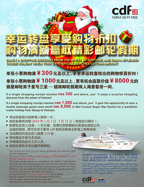 圣誕元旦臨近,旅游價格相對平穩(wěn)、上班族集中休假等因素使得今年雙節(jié)旅游市場再次迎來出游小高峰。其中不少公司白領將春節(jié)出境游計劃提前,選擇性價比更高的錯峰出游。各大商家的年終促銷活動讓節(jié)日提前升溫,2013年12月15日-2014年1月5日期間,中國免稅品(集團)有限責任公司(以下簡稱中免集團)旗下十家免稅店聯(lián)合推出“幸運轉出來&幸運秀出來”年終主題促銷活動,貼心的購物折扣以及價值約百萬元的麗星郵輪船票大獎,為雙節(jié)出境游客送上別樣驚喜。