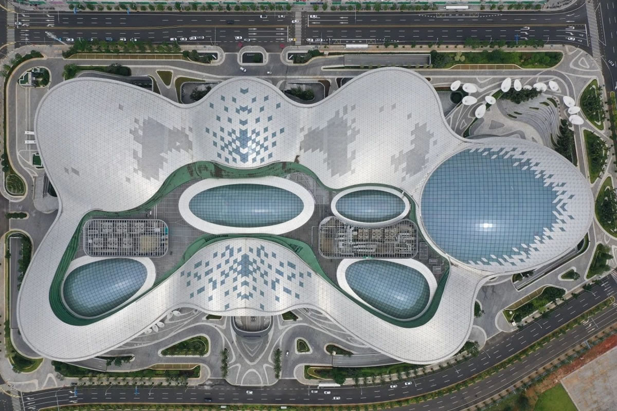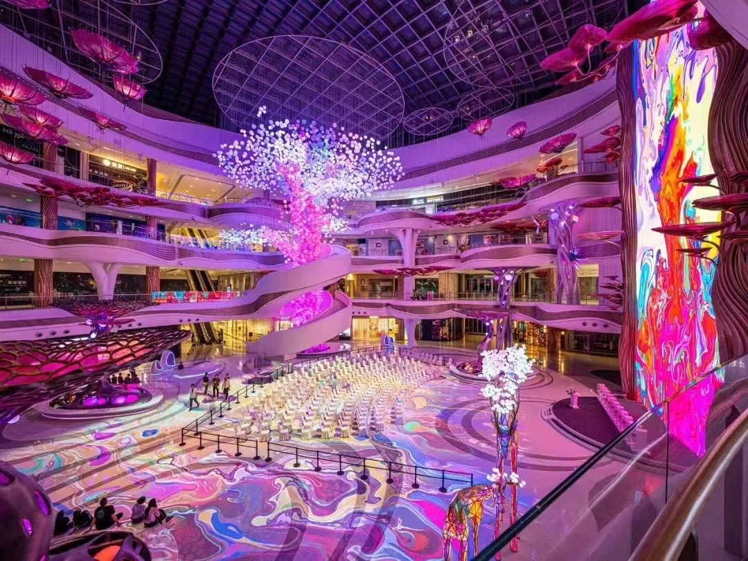 ▲海口國際免稅城項(xiàng)目“AURA天際秘林”中庭(攝于調(diào)試階段)