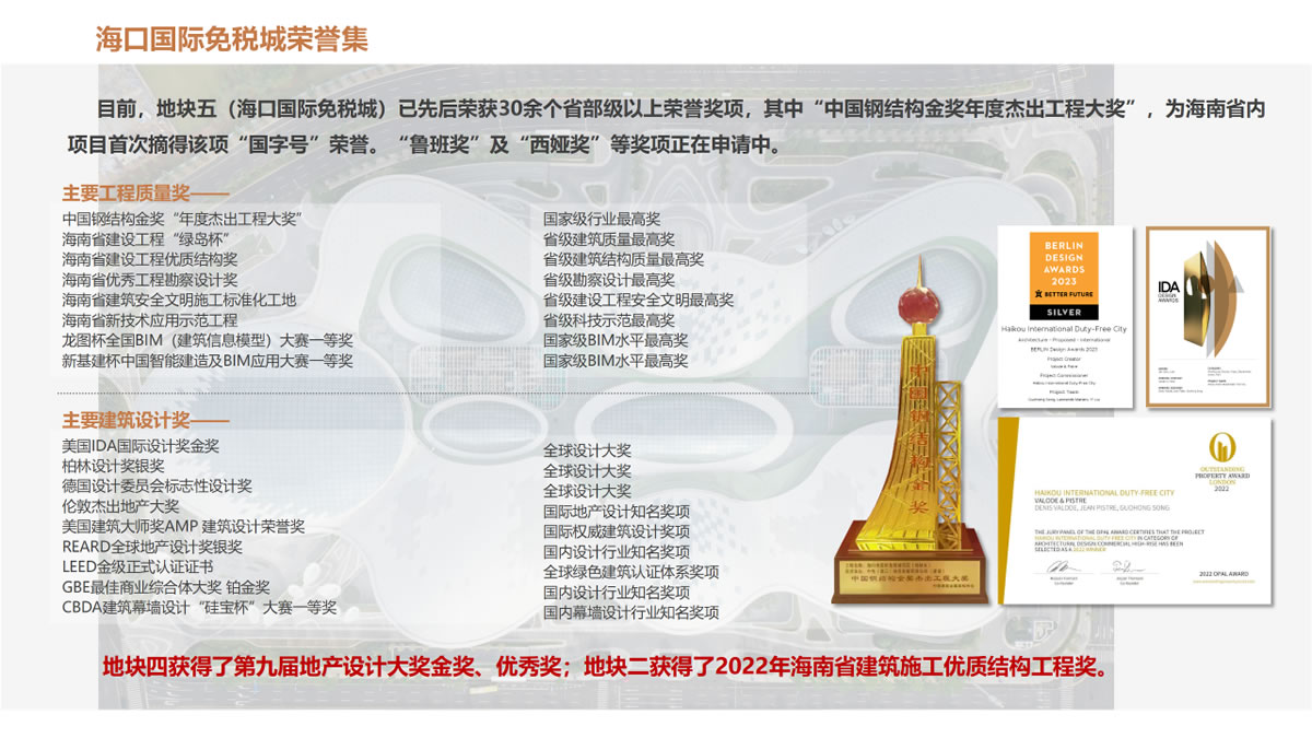 ▲ 海口國際免稅城項(xiàng)目整體建設(shè)所獲榮譽(yù)